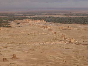 | アラブ城から望む | 遺跡の左に現在の街、右に塔墳群(墓の谷)がある | ||||||||