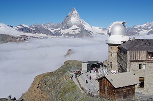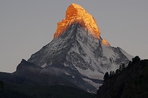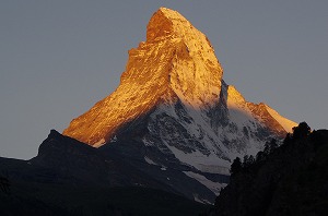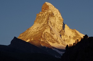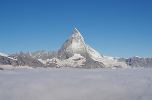| アルプスの名峰、マッターホルンです。標高4,478mを誇る独立峰で、姿が雄大で美しくスイスの象徴となっています。早朝、始発の登山鉄道に乗って山麓の町ツェルマット(標高1,620m)を出発し、ゴルナーグラード展望台(標高3,089m)に到着したときは、眼下に雲海が広がっていました。時間と共に変わりゆく景色をお楽しみください。(2013年8月撮影) | |||||||||