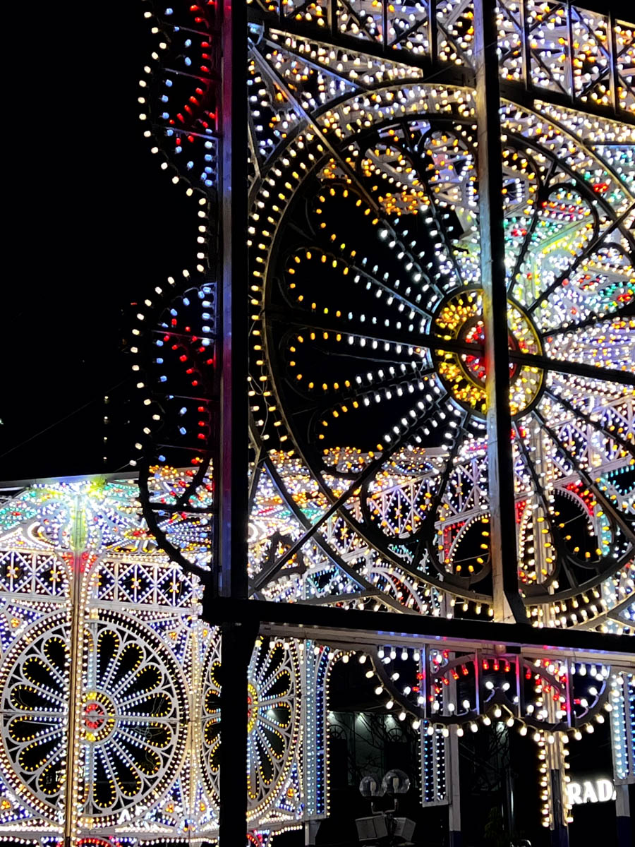 バラ窓のようなドッピオガゼボの装飾と、円形の光の彫刻「ソローネ」。