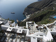 フィラは、サントリーニ島の西側にある、中心の町です。多くのホテルやショップがあり、シーズンには観光やリゾートの客でにぎわいます。