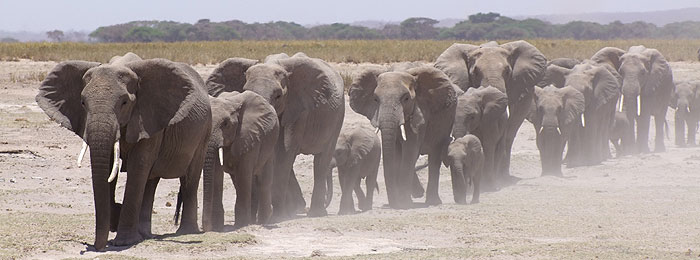 ゲームサファリ(陸上のアフリカゾウ)アンボセリでもっともウォッチングを満喫した動物といえば、なんと言ってもアフリカゾウ。マサイマラで「ゾウさんだ!でもちょっと遠いなぁ...」と残念に思うシーンがあって、そのとき現地ガイドに「アンボセリでたくさん見られるから」といわれたのですが、にわかに信じられませんでした。しかし、本当にアンボセリで、アフリカゾウのいろんな姿をたっぷりと見ることができました!