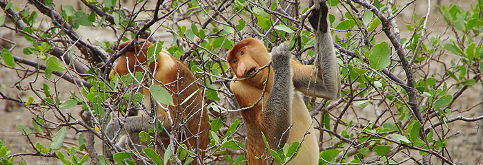 | 動物の楽園バコ国立公園には、ボルネオの固有種である3種のサルがいます。グループで公園内を移動しているので、確率の高そうなところを歩きながらの出会い待ちです。今回は2回訪れて3種とも写真に収めることができました(^^) |