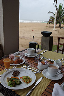 深夜、コロンボの空港に到着して、車で30分ほどの所にあるリゾート地ニゴンボに宿泊。睡眠時間は少なめだけど、時差が少ない(日本の3時間半遅れ)おかげか意外に元気!ちょっと強めの潮風を浴びながら、優雅に朝食をいただきました。