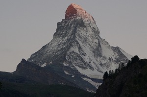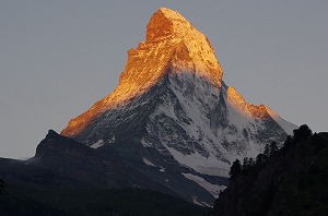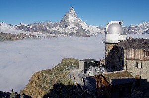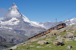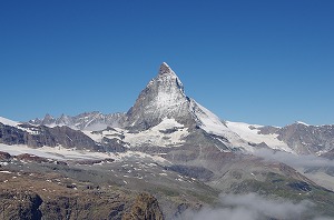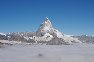 | アルプスの名峰、マッターホルンです。標高4,478mを誇る独立峰で、姿が雄大で美しくスイスの象徴となっています。早朝、始発の登山鉄道に乗って山麓の町ツェルマット(標高1,620m)を出発し、ゴルナーグラード展望台(標高3,089m)に到着したときは、眼下に雲海が広がっていました。時間と共に変わりゆく景色をお楽しみください。(2013年8月撮影) | |||||||||