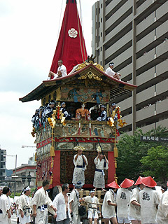 祇園祭 山鉾巡行 2004−夏の京都の風物詩!32の山鉾が京都の町を巡行−(2004.07.17)祇園祭の山鉾巡行を観覧席で見るツアーに誘われました。祇園祭の山鉾組み立ては見たことあるけど、巡行をみるのは初めて。今年は土曜日というチャンスでもあったので行くことにしました。 有料観覧席は屋根なしで、パイプいすを7列ほど並べただけ(ラッキーにも最前列!)なので、直射日光が容赦なく照り付けます。簡易の帽子は用意してくれていたものの、1時間半ほど見ているだけで手足も顔もこんがり焼けてしまいました。そんな炎天下の中、山や鉾を曳いたりお囃子を演奏したりしている方々は、さぞかしたいへんだったことでしょう。 ツアーではいい席を確保できるようですが、昼食の時間の関係上最後まで見られなかったのが心残り。 今回は細かいところまで見られるように、ちょっと大きめの写真を掲載しました。とくとごらんあれ(^^)