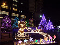 関電キャラクターくまのベンチと、関電ビル前のライトアップツリー。