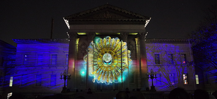 OSAKA光のルネサンス2015−中之島の水辺に広がる光のアートフェスティバル−(2015.12.14)前述「ウォールタペストリー特別写真撮影会」上映前に通常上映(特別公演)を2回みて、写真撮影会後に22:00までライトアップされているフランスアベニューを歩きました。