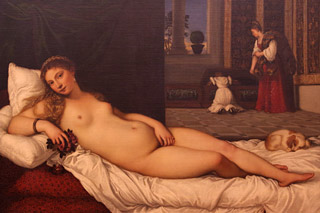 フィレンツェ・ウフィッツィ美術館所蔵 「ウルビーノのヴィーナス」。 (2015年5月撮影) これはもはや宗教画ではなく美人画。 同じ人がモデルとも言われています。 大きな写真 |