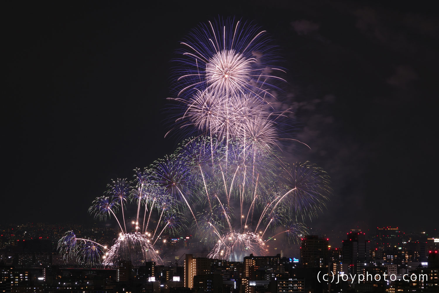 第34回なにわ淀川花火大会(2022.8.27)2022年8月27日、大阪で久々に花火大会が催されるとのことで、混雑の心配なく涼しいプライベート空間でなにわ淀川花火大会を楽しめるホテルプランを申し込みました。 2017年にも同ホテルのプランを使っています。(2017年のなにわ淀川花火大会の様子はこちら)会場からはちょっと離れているものの、作品は見えるし予算もお手頃なので2回目の利用、5年ぶりとなります。 17時からの夕食がついていて、早めにチェックインし撮影機材をセッティングしました。室内照明対策も、前回活躍したレンズスカートでバッチリです。部屋は24階で、このホテルの中では低層階。以前は多分40階以上で淀川から花火が上がっている景色でしたが、今回はビルの合間から上がってる感じです。花火は見えましたが、上のフロアの方が100%見えてる実感はあります。