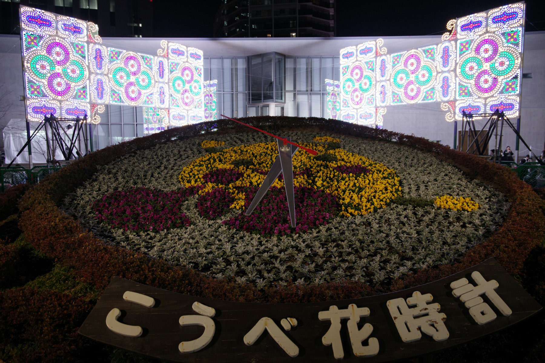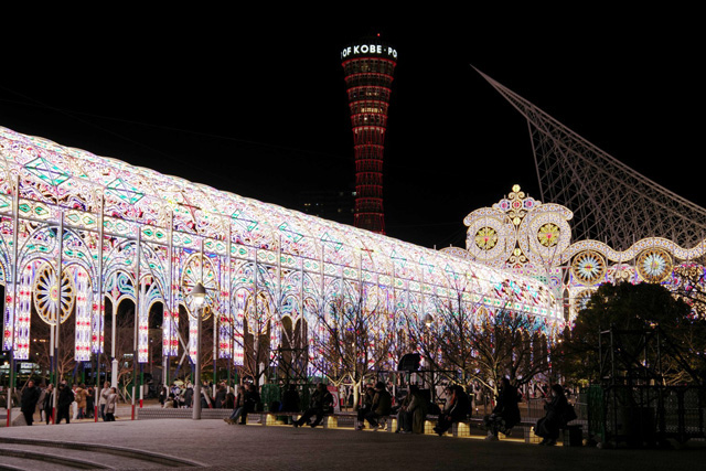 東遊園地のルミナリエと、赤く浮かび上がる神戸市役所の市章。