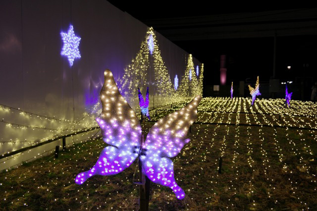 波止場町緑地のイルミ。光の草原をはばたく蝶が幻想的
