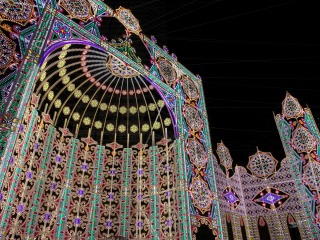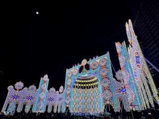 夜空を背景にそびえる、光の巨大な大聖堂。