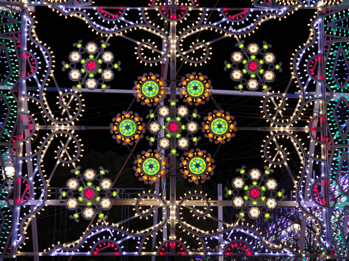 南側園地の花時計周辺を彩る、高さ約9mの光の壁「スパッリエーラ」。