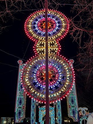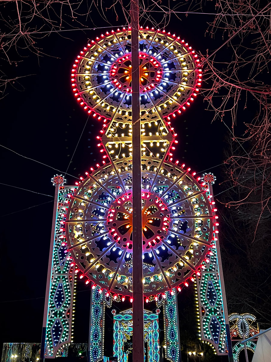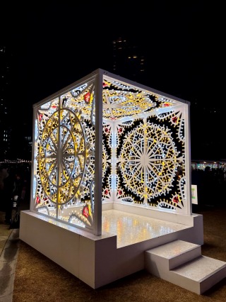 バラ窓のようなドッピオガゼボの装飾と、円形の光の彫刻「ソローネ」。