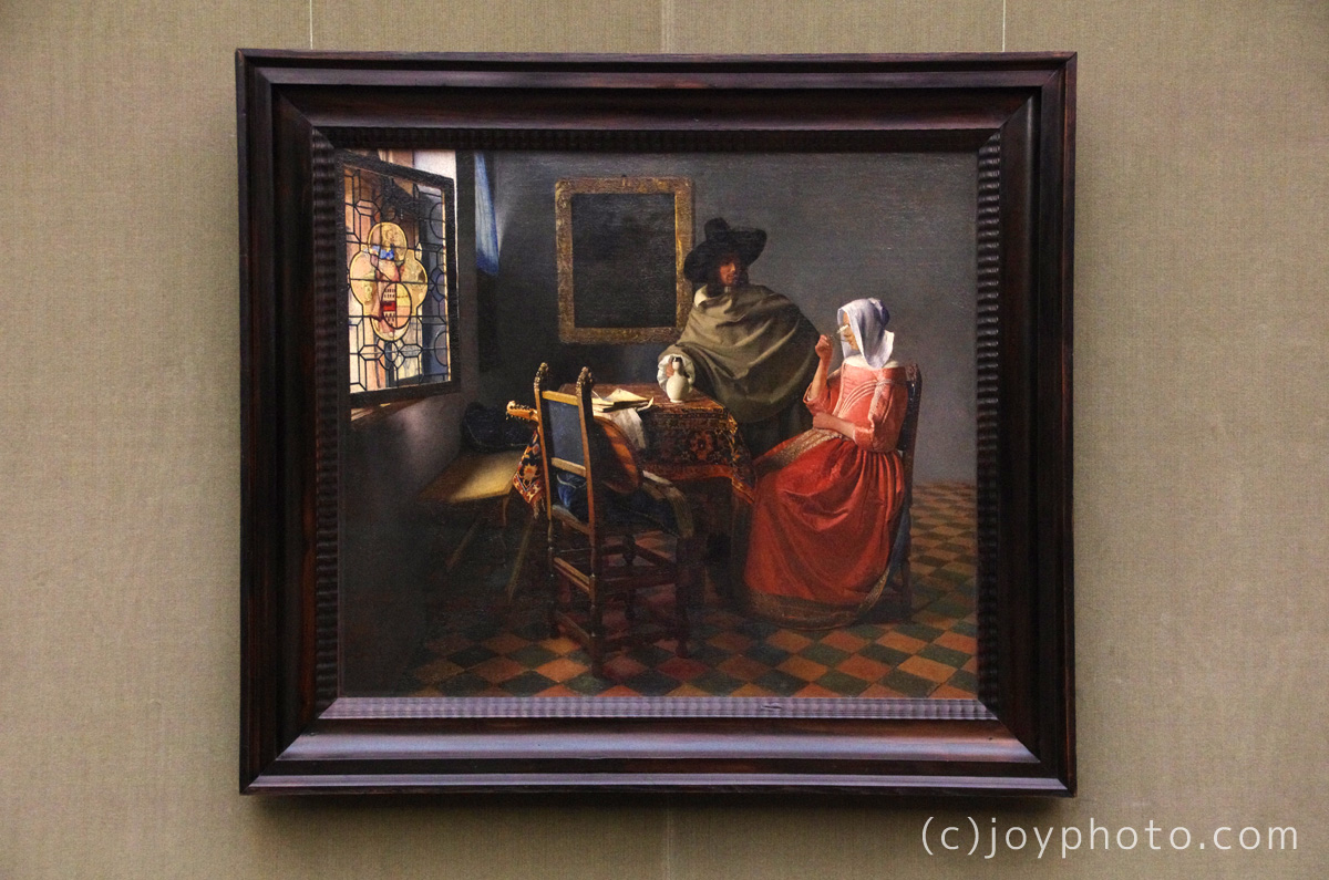 | ワイングラス(1661〜62年頃) 同僚画家ピーテル・デ・ホーホの影響を見ることができる作品。 男女の関係に庶民の俗っぽさはなく、高貴な身分に置き換えています。 |
