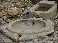 亀型石造物と小判型石造物。亀型石造物の愛敬ある姿は、地元のお土産品にもなっています。