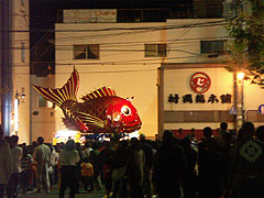 宵山宵山はコースの中でカーブが最も急(ルートの最も東。の角度は270度以上。)なスポットにて鑑賞!近くに醤油工場があり、一帯ほのか〜にしょうゆのいい香りが漂っている場所です。 唐津くんちでは、曲がり角で特に気合を入れて曳かれるため、見どころとされているポイントの1つです。夜道で光量が少ない、兼高速で近づいては去っていくため、焦点距離があわなかったりブレたりして、最初は写真を撮るのに戸惑いました。後半はISOをあげたり焦点やシャッター速度を固定して、なんとか数枚の写真を撮ることはできました(^^;)