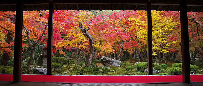 | 紅葉が広がる庭園に続く門。 |